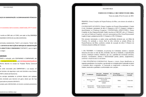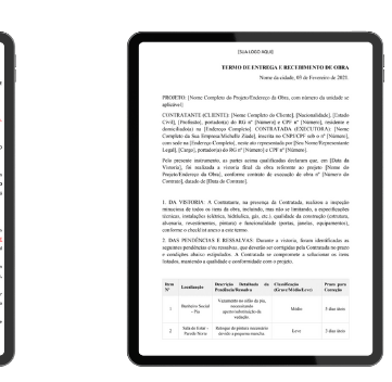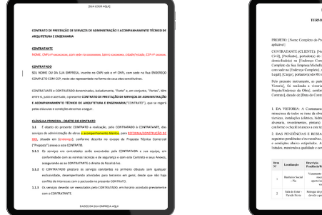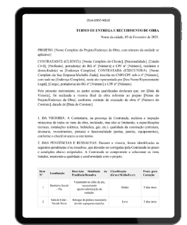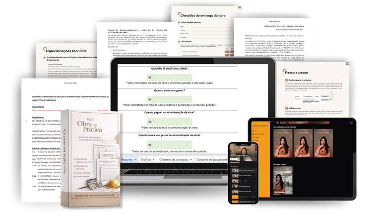 Receba os documentos prontos para personalizar - contratos, checklists, planilhas, manuais, termos de responsabilidade, vistoria - todos validados em obras reais para profissionais que querem assumir o controle da obra e aumentar seu lucro!