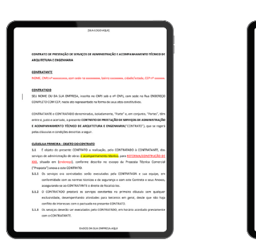 Blindagem jurídica com cláusulas claras, feitas com apoio de advogados. Protege você de acordos verbais e conflitos com clientes.